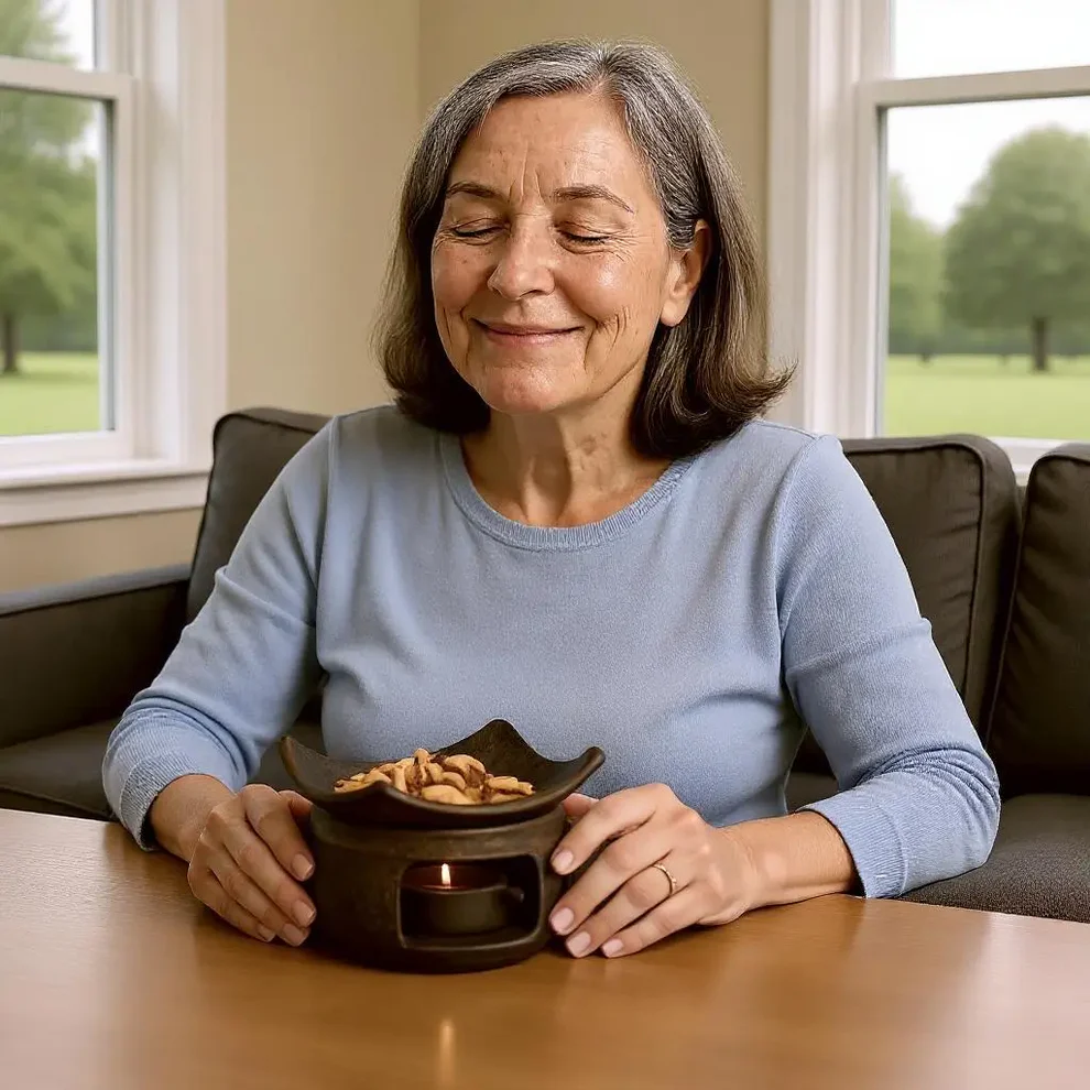 Place a small amount of dried botanicals—like cedar chips, citrus peel, rose petals, rosemary or coffee beans—on the ceramic plate and light the candle beneath. Gentle heat warms and releases the botanicals’ natural aromas, creating an inviting scent without airborne sprays or synthetic oils. Sessions are typically used for about 30–40 minutes, then the plate is left to cool before cleaning.